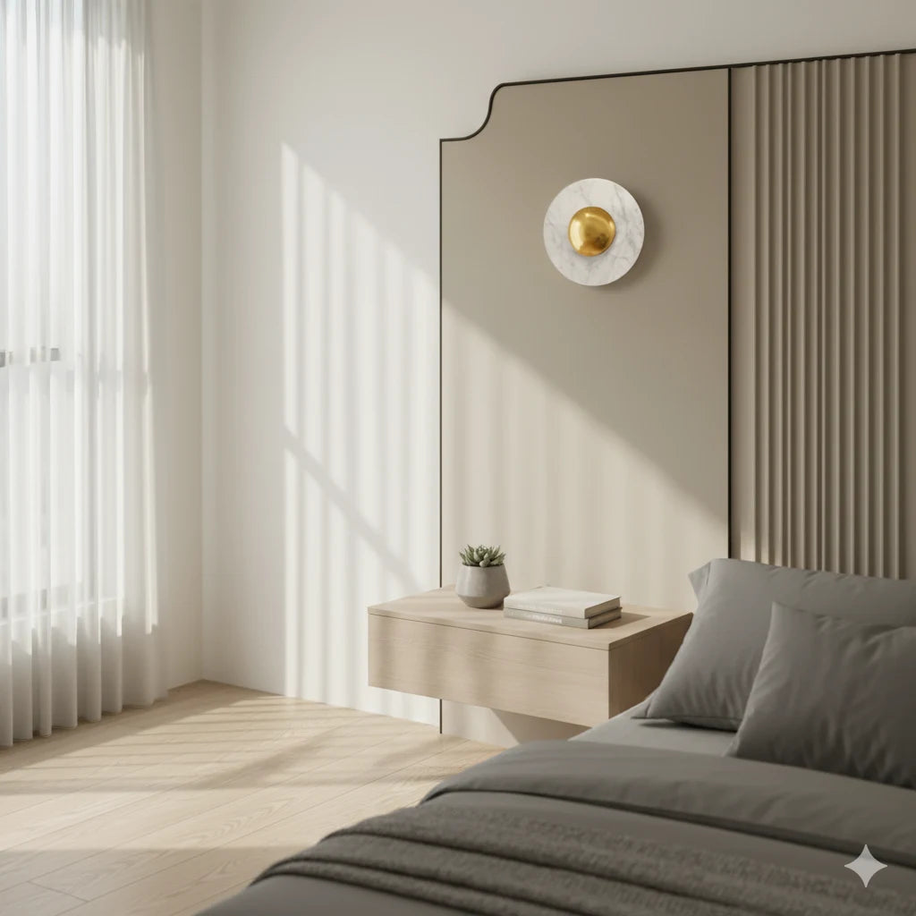 Elevate your interiors with the Aura Luxury Marble Wall Sconce . This stunning modern brass wall light features a natural round marble or alabaster disc, casting a soft, ambient glow. Perfect as a designer bedside lamp, a sophisticated hallway wall light, or an elegant accent in your living room. Shop this premium home decor light online in India for a touch of refined elegance.