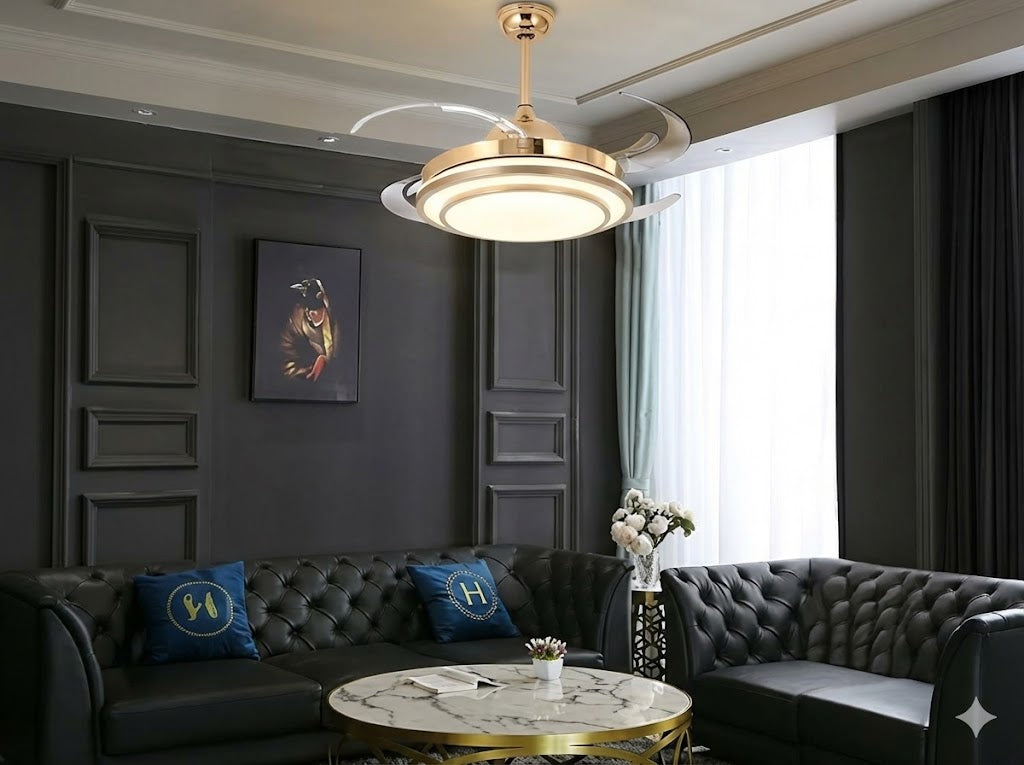 Modern ceiling fan combines a sleek golden finish with retractable acrylic blades.