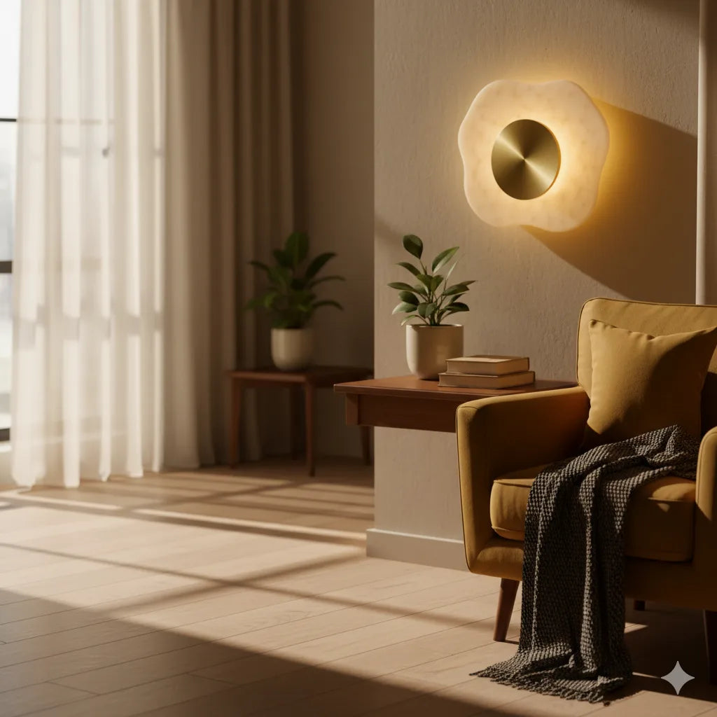 Introducing the Helios Round Marble Wall Sconce . A masterpiece of minimalism and luxury, this modern brass wall light features a natural white marble backplate contrasted with a polished gold/brass centre. Perfect as a designer bedside wall lamp or for creating a sophisticated ambient glow in your living room or hallway. Shop this exquisite home decor light online in India.