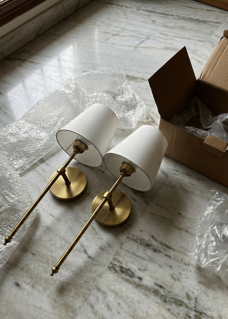 In the Box: 2 x Ivory Grace Wall Sconces, 2 x Fabric Shades, 2 x Warm LED Bulbs, Mounting Hardware, Installation Kit.