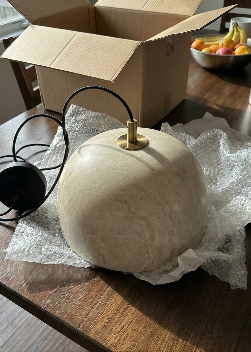 In the Box: 1 x Natural Marble Shade, 1 x Adjustable Cord & Ceiling Rose, 1 x Warm LED Bulb, Installation Hardware.