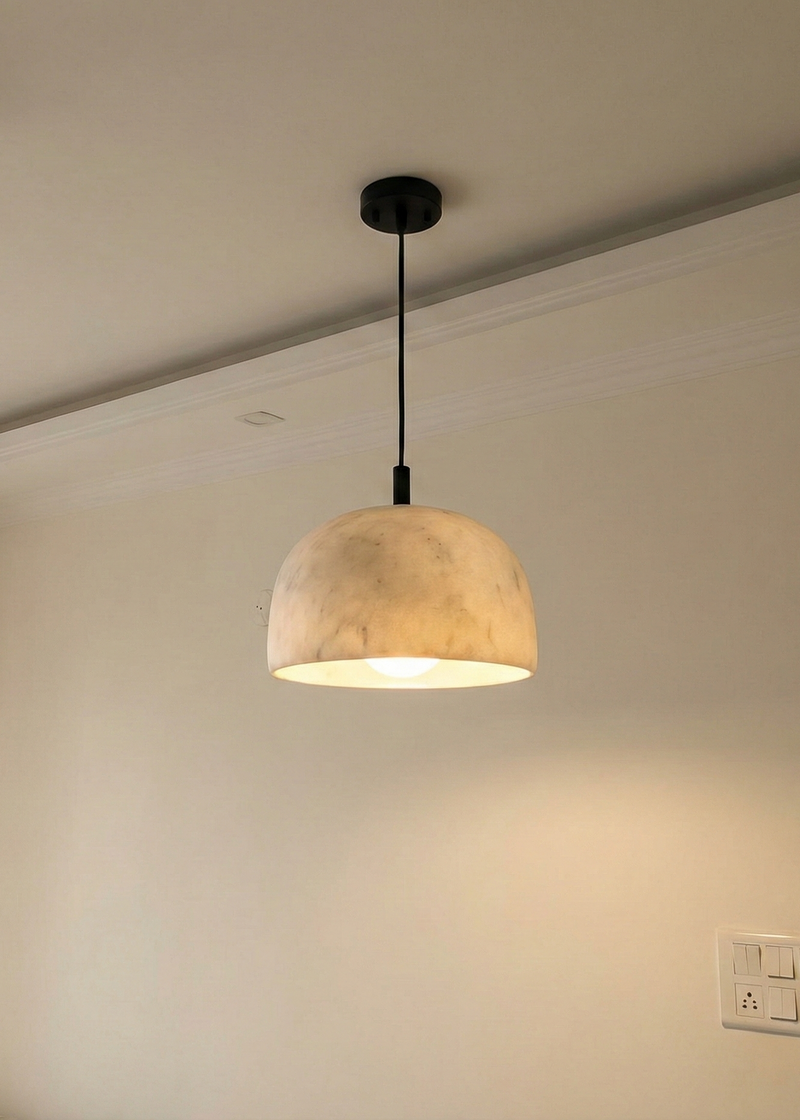 The hand-polished matte surface of the stone offers a tactile, high-end feel, while the classic dome silhouette directs light downward for focused, intimate illumination. Whether positioned over a kitchen island or used as a sculptural bedside accent, the Luna Dome brings a weighted, premium presence to your interiors that synthetic materials simply cannot replicate.