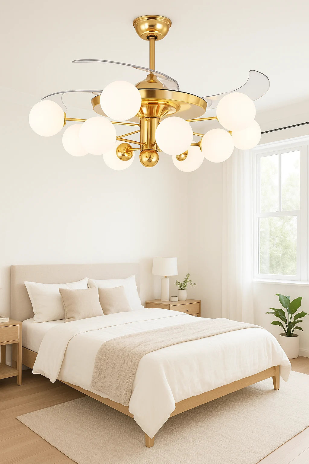 Elevate your interiors with this stunning luxury ceiling fan featuring a golden finish and elegant frosted glass globe lights. Designed to combine functionality with premium aesthetics, this chandelier-style fan adds a sophisticated touch to living rooms, bedrooms, dining areas, and offices. With its powerful motor, smooth airflow, and ambient lighting, it is the perfect fusion of style, comfort, and utility.