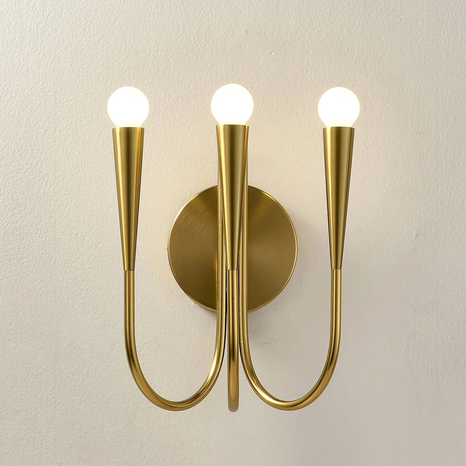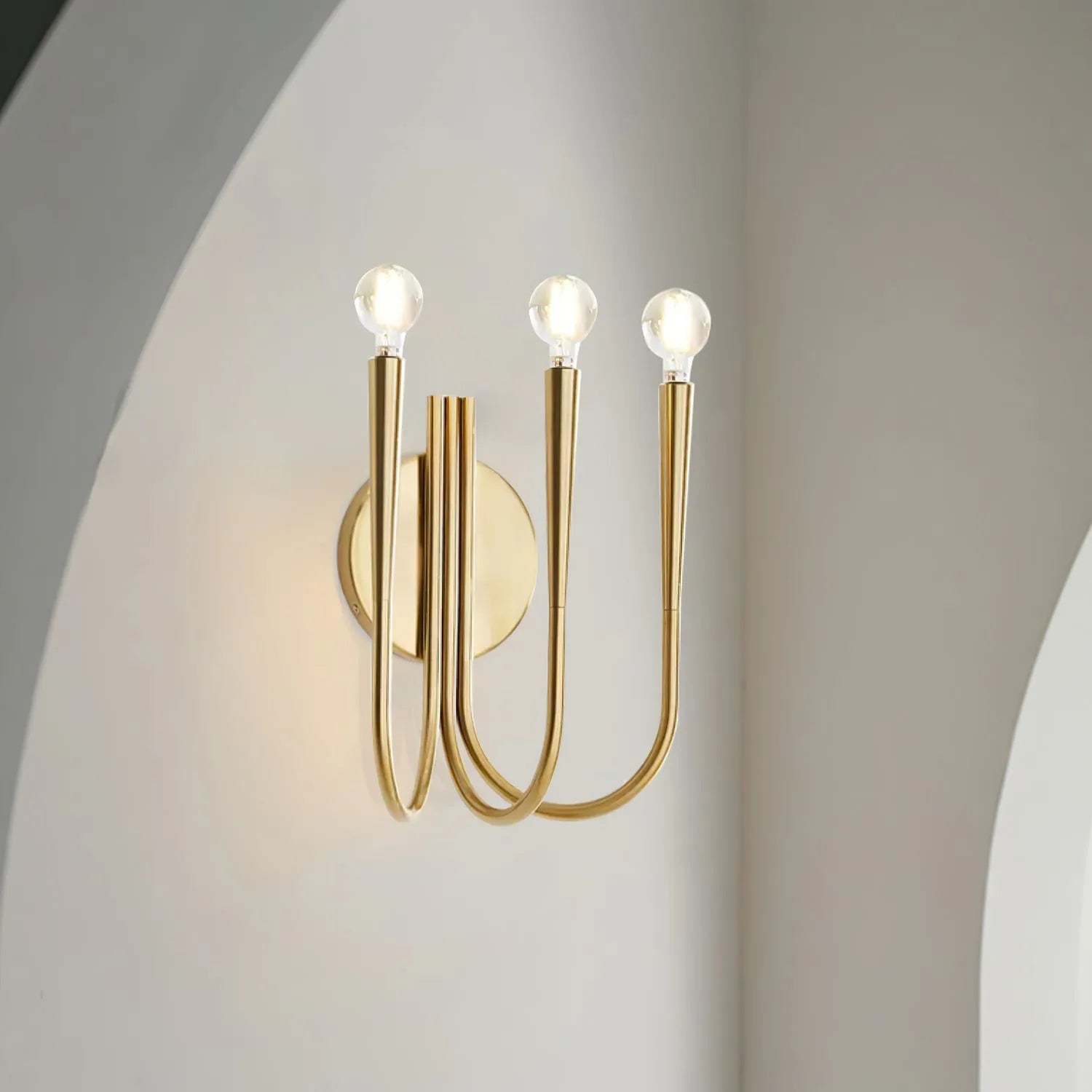 Add a touch of modern elegance to your interiors with this luxurious gold wall sconce. Designed with three upward curved arms and crystal-clear bulb heads, this piece combines minimalist modern style with a sophisticated golden finish.