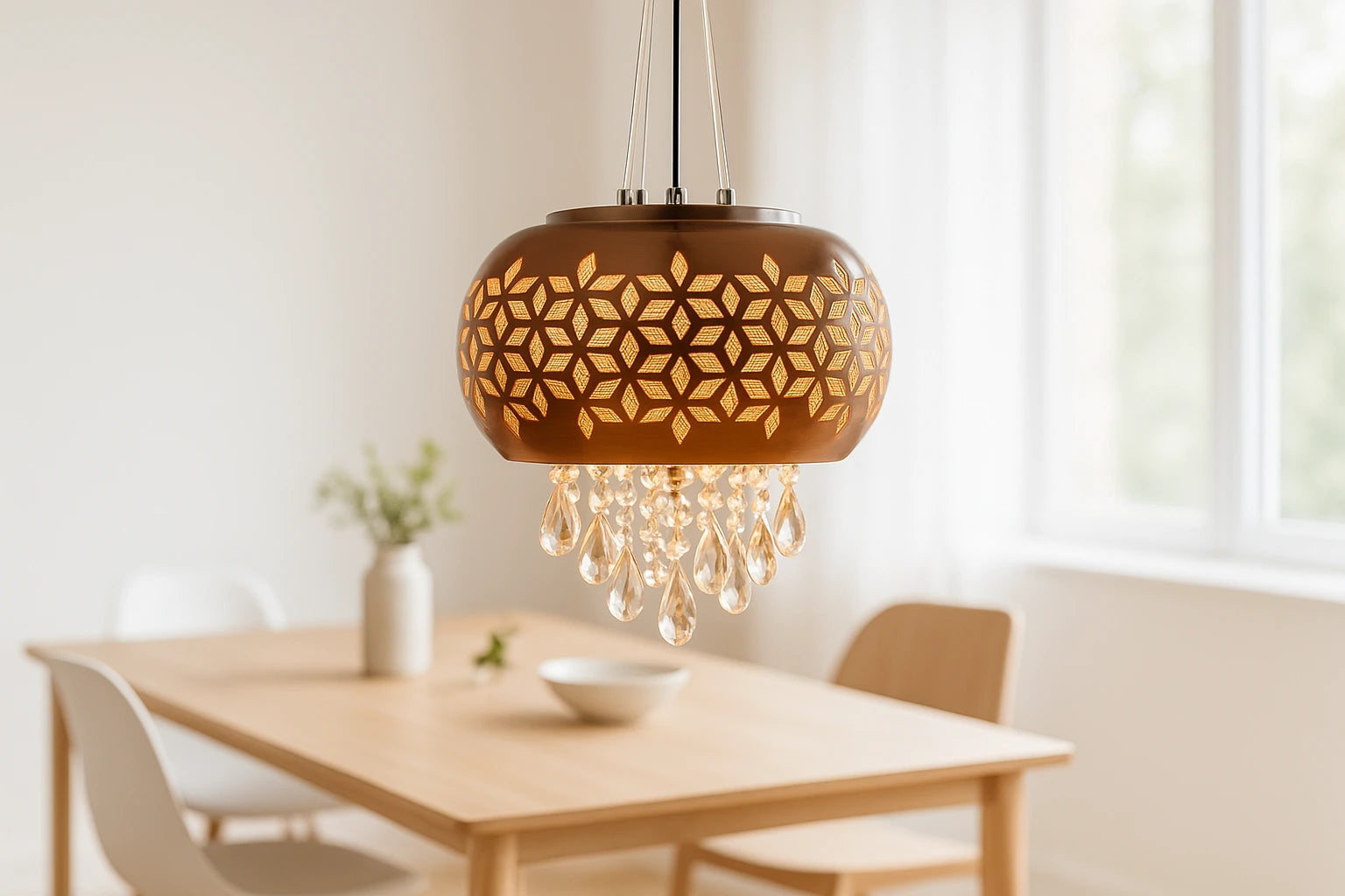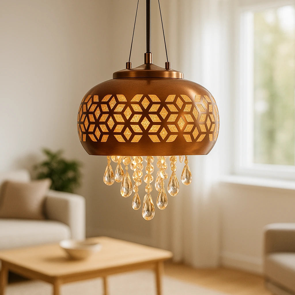 The B&BRegalia Prism Drop Pendant brings palace-grade grandeur to your space. With a patterned golden dome and an opulent cascade of teardrop crystals, this piece is designed to dazzle.