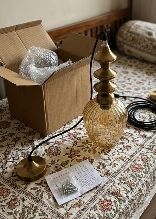 In the Box: 2 x Amber Glass Shades, 2 x Brass-Finished Hardware Sets, 2 x Warm LED Bulbs, Installation Hardware.