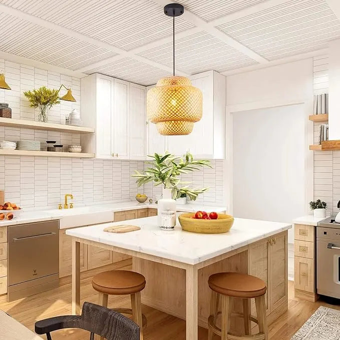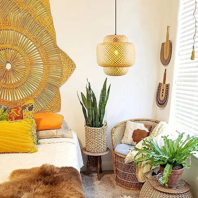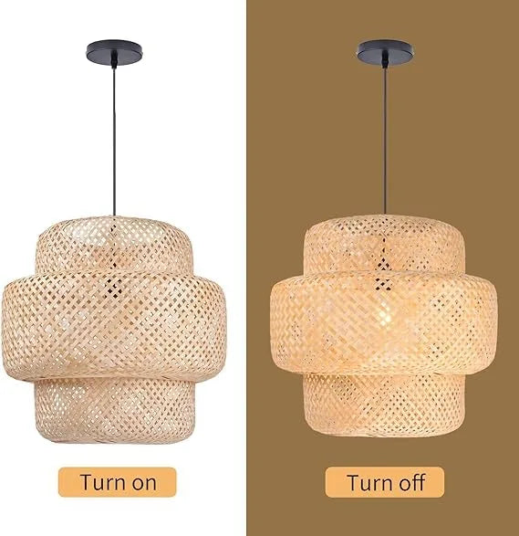 A handcrafted masterpiece that blends natural elegance with modern design. This pendant light features a double-layered drum shape woven from natural bamboo, creating a soft, diffused glow when lit. Even when turned off, it adds a chic bohemian touch to your space.