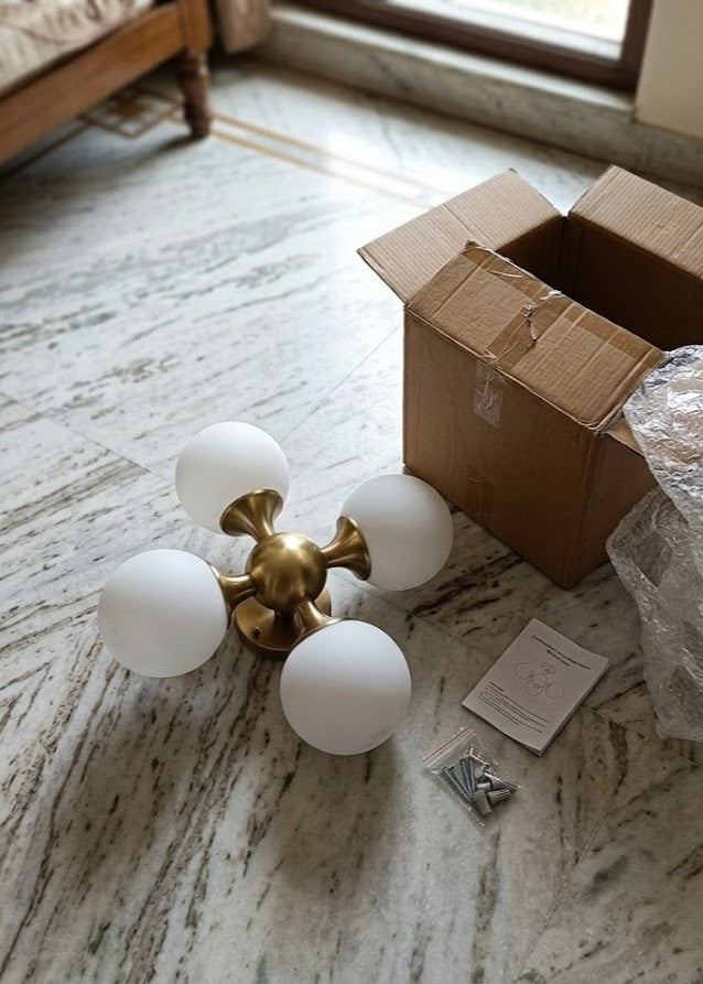 In the Box: 1 x Linear Brass Frame, 4 x Frosted Glass Globes, 4 x Warm LED Bulbs, Installation Hardware.