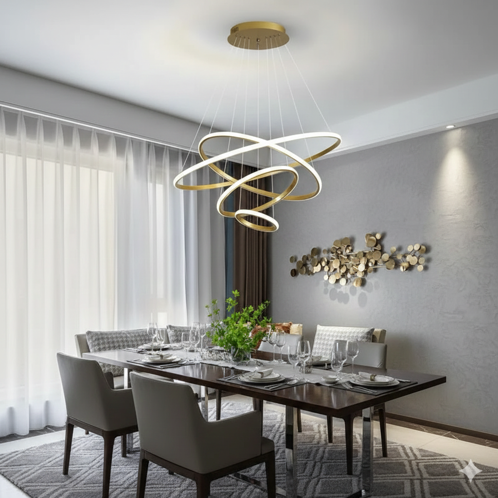 Installed above a dining table, it gives a high-end restaurant vibe. The rings frame the table area and make every meal feel more special.