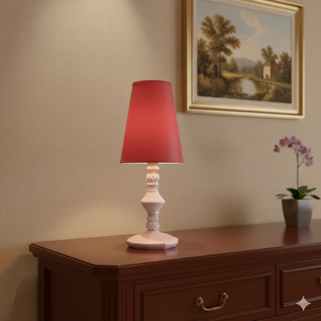 This blush pink bedside table lamp adds a warm, cozy glow to any bedroom, living room or study. The sculpted base pairs beautifully with the tapered red fabric shade, creating a soft ambient light that is perfect for reading, relaxing or winding down at night. Its compact footprint fits easily on side tables, consoles and work desks, making it a stylish accent piece as well as a practical lighting solution.