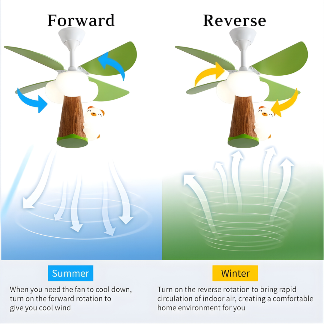 This charming children's ceiling fan features a creative "forest" design, highlighted by a central "tree trunk" housing with a playful climbing bear character and four green, leaf-shaped blades. Designed for year-round comfort, it utilizes a quiet, reversible copper motor that provides cooling airflow in summer and circulates warm air in winter. The fixture includes an integrated LED light with three adjustable color temperatures (White, Natural, and Warm) to suit different moods. The 32.6-inch unit is operated via a handheld remote control, which manages fan speed, lighting, and intelligent auto-off timing settings.